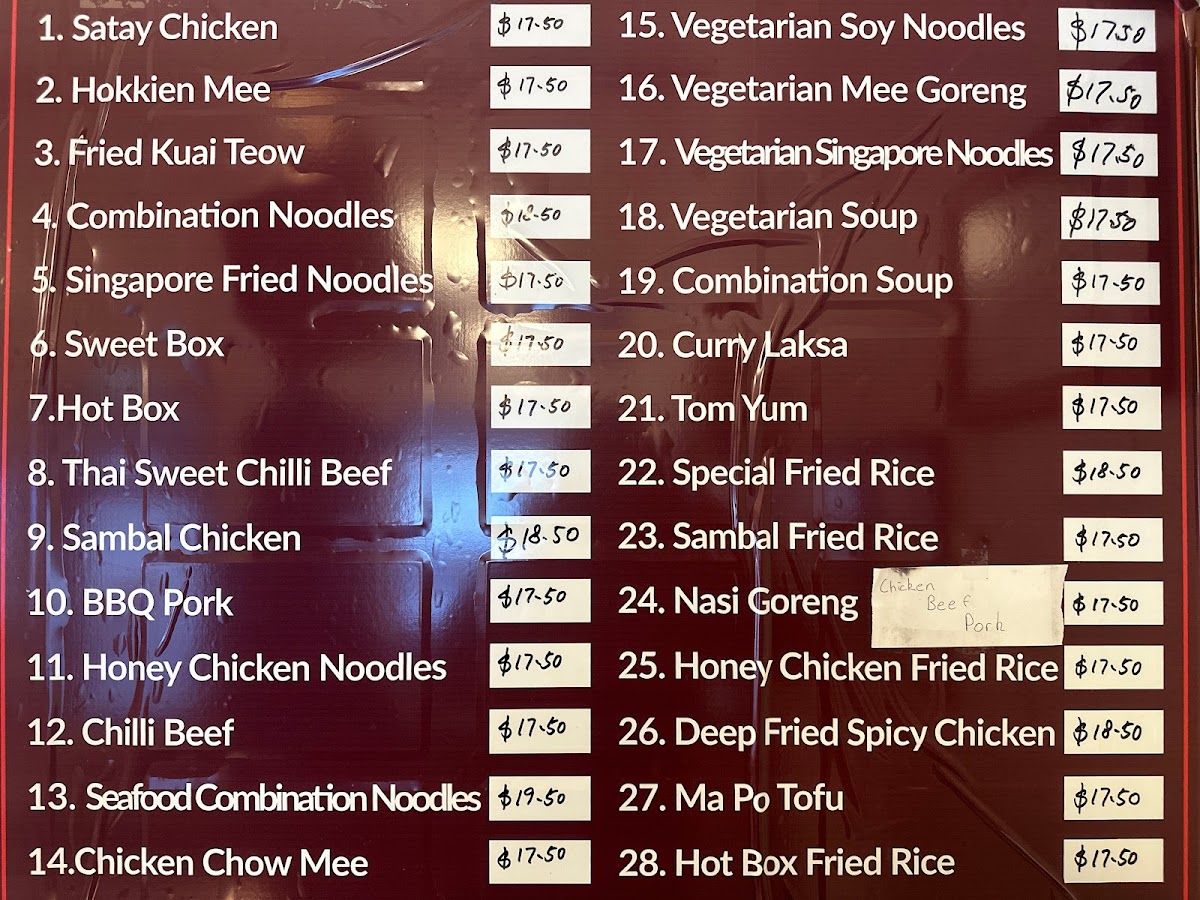 Starting with their Nasi Goreng, you can choose from options like Chicken, Steak, Pork or Shrimps. This dish is a flavorful combination that provides a satisfying meal. If you're looking for something lighter or vegetarian, the Vegetarian Soup and Vegetarian Singapore Noodles are excellent choices, priced at $18 and $17 respectively.