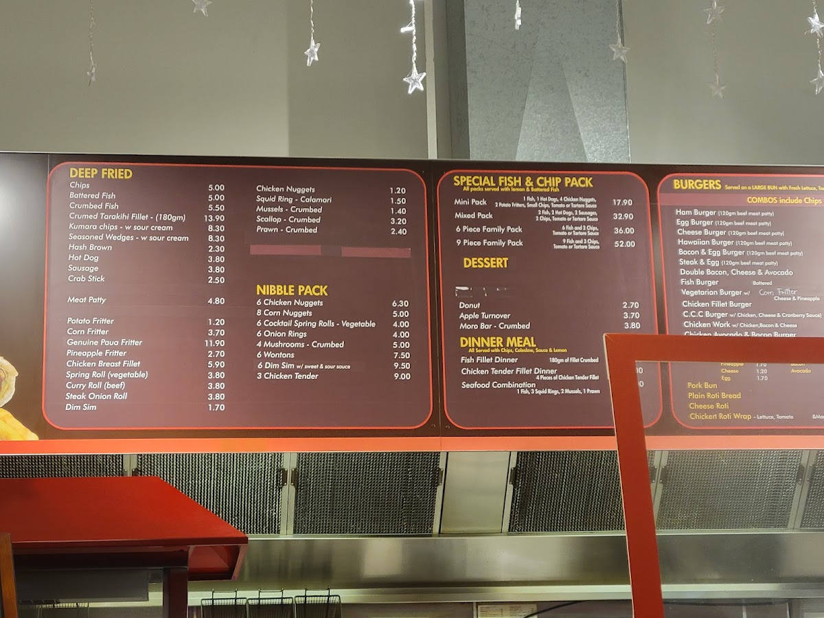 1 fish, 1 hot dog, 4 chicken nuggets, 2 potato fritters, small chips, tomato or tartare sauce.